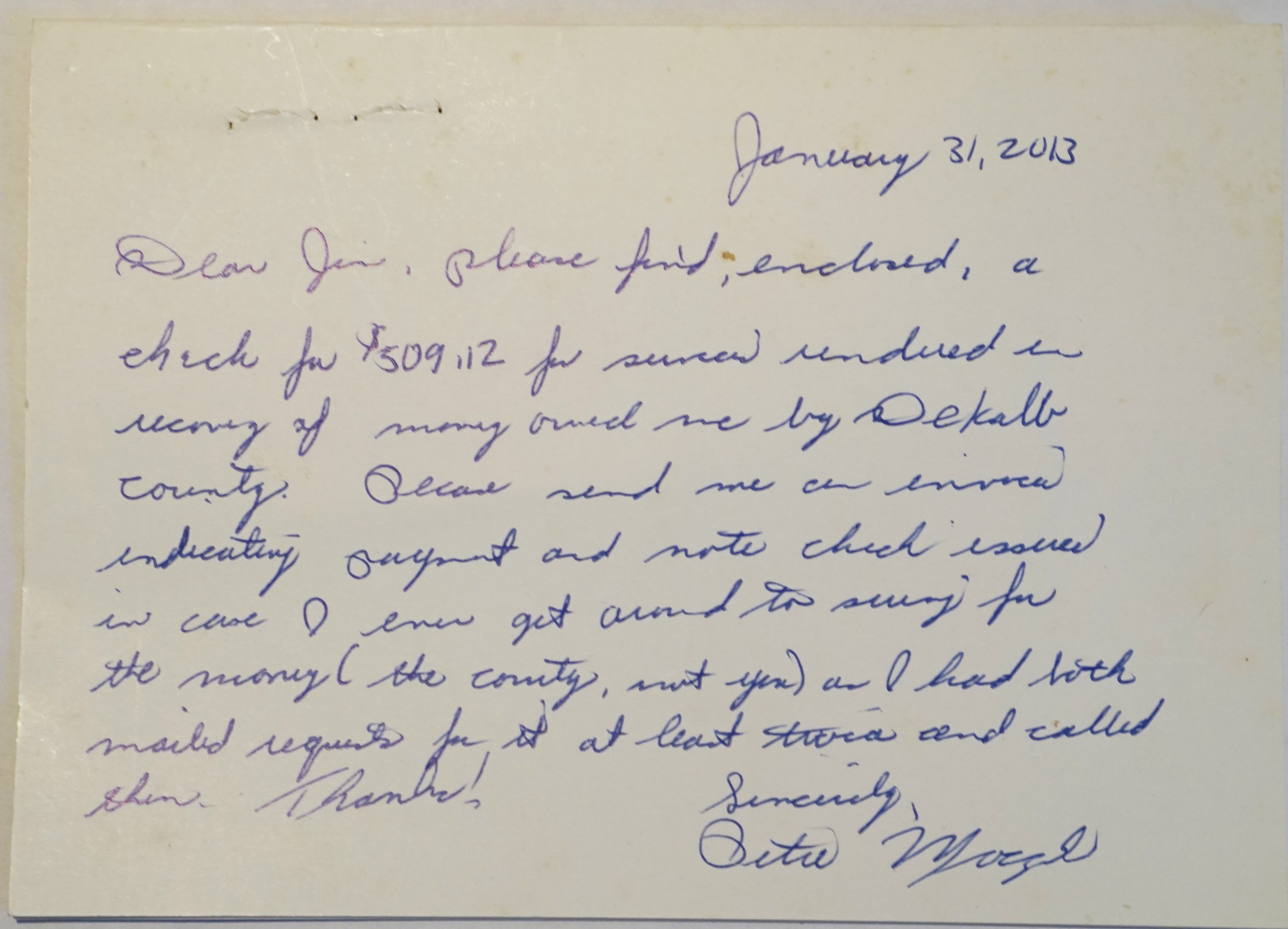 The displayed check and thank you note was an Unclaimed Refund from a county taxing body. The claimant had no idea of the funds until we worked together for a successful recovery.